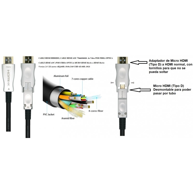 CABLE HDMI AOC (POR FIBRA OPTICA) MICRO HDMI Macho a HDMI Macho Version 2.0 15 metros 4K@60Hz 3840x2160 UHD 4K 60Hz 18Gb (CABLE HDMI HIBRIDO, CABLE HDMI AOC POR FIBRA OPTICA) AOC (Active Optical Cable) premium alta velocidad/ HEC 4K@60HZ 18 Gbps (Cable HDMI desmontable por un extremo para poder entubar y pasar los tubos y lugares estrechos)