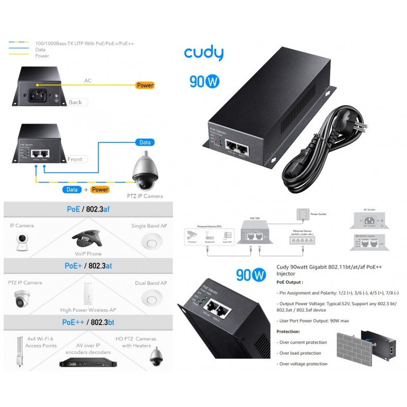 INYECTOR RJ45 100/1000 POE++ 90W hasta 56V, Determina el voltaje y potencia de modo automatico Compatible with IEEE 802.3af / 802.3at / 802.3bt